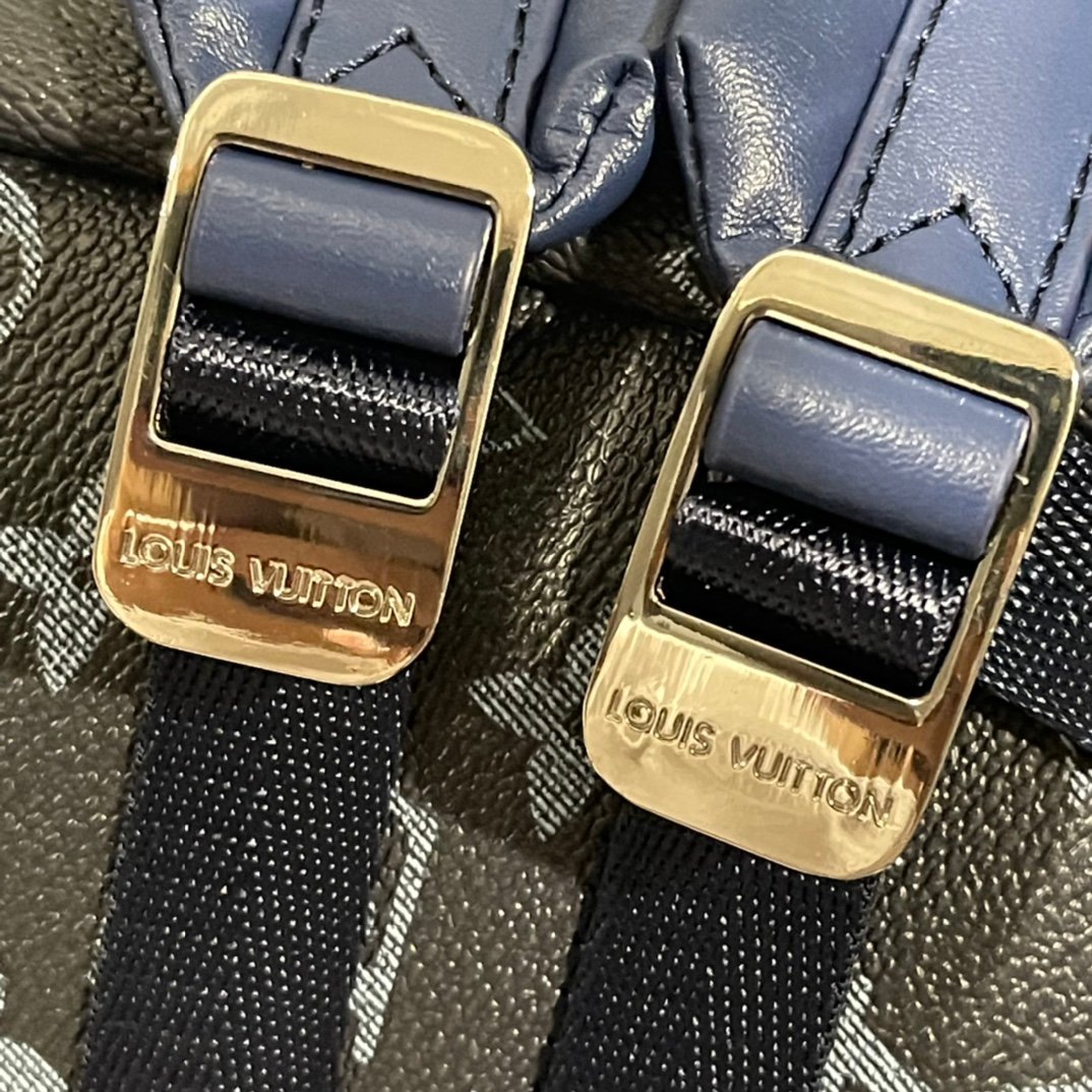 Gradual change blue. the latest Discovery small backpack features deep Monogram Eclipse Reverse coated canvas to create a chic look with the gradual disappearance of Quanfu Monogram patterns. and then imbue the leather label. zipper edge and top handle with bright tones. Zippered front pockets and open side pockets perfect the details for daily carry.