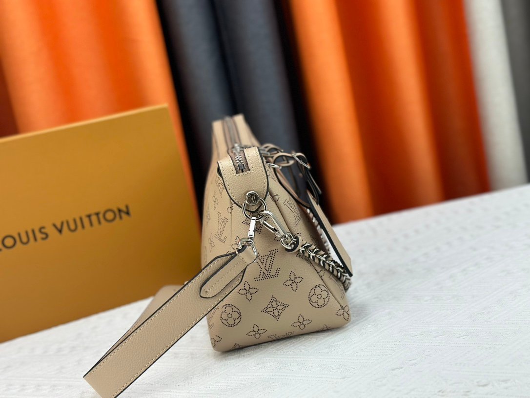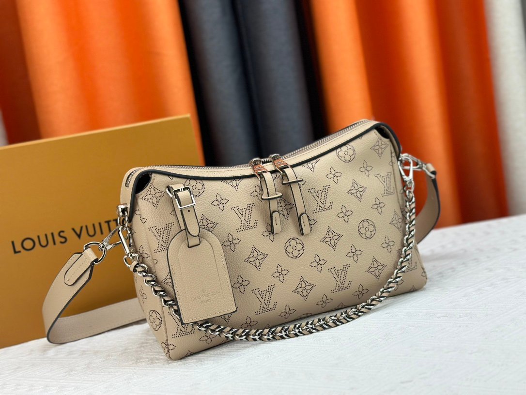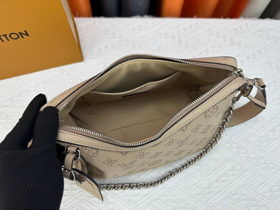 This Mahina Hand It All handbag is made of delicate perforated cowhide leather. Its elegant draping texture highlights the unique bag silhouette. The leather shoulder strap and the chain leather braided handle are both detachable. providing a trendy choice for daily outings. 29.0 x 18.0 x 13.0 cm (length x height x width). Perforated cowhide leather. Cowhide leather trim. Microfiber lining. Interior patch pocket. Metal studs. Shoulder strap.