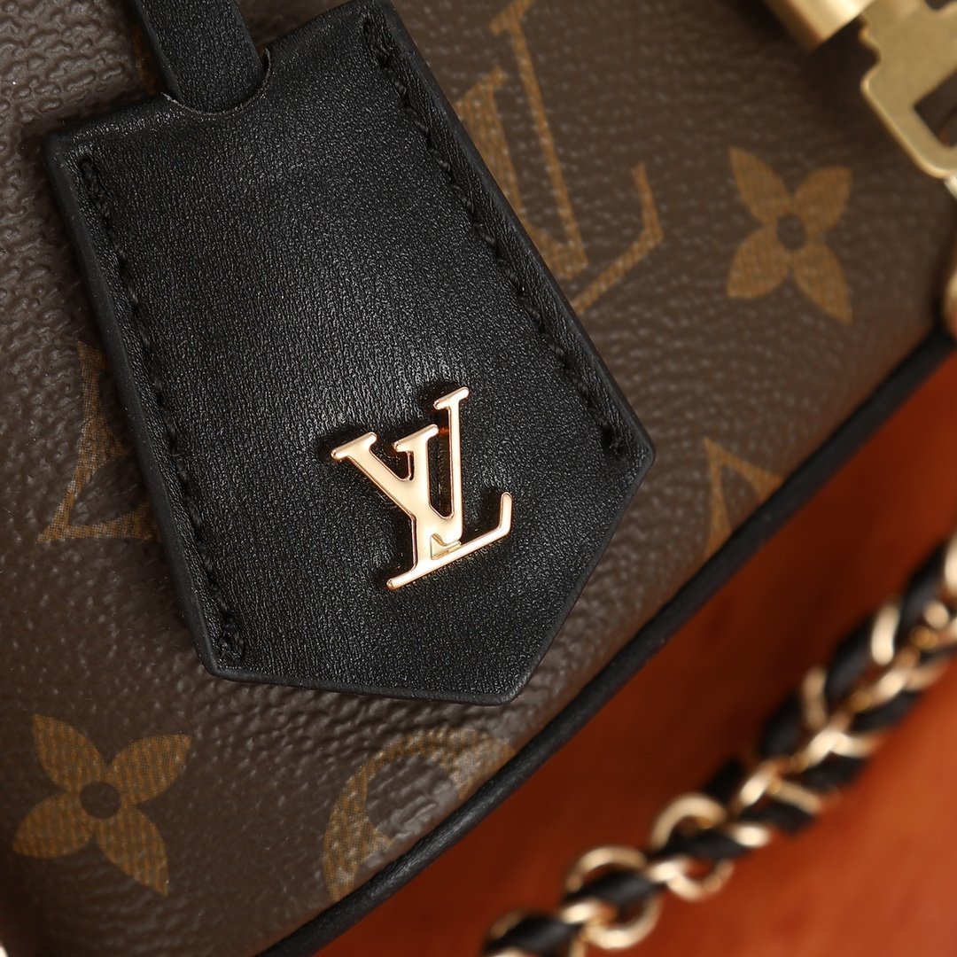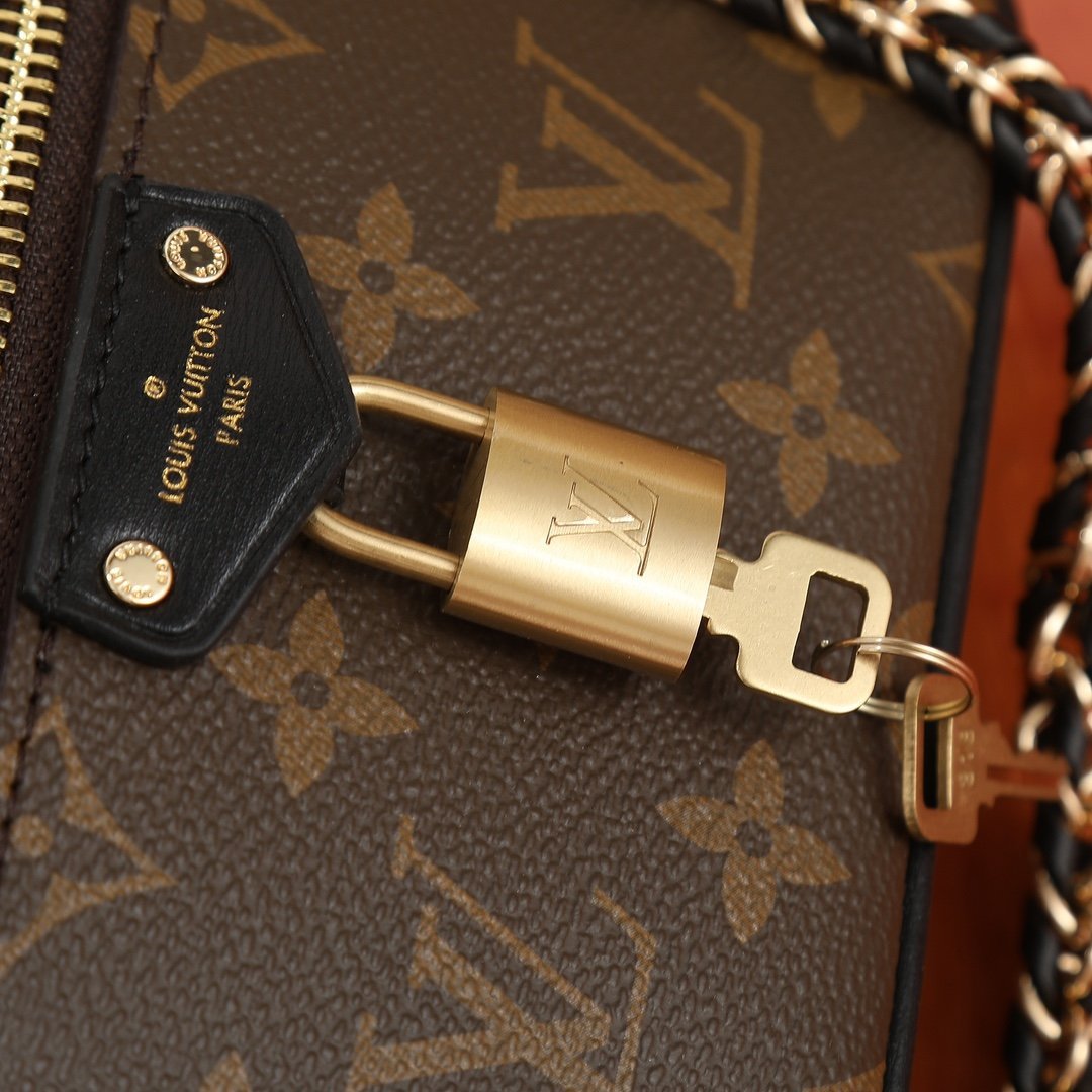 The M47125 Vanity Chain Pouch handbag takes inspiration from classic vanity cases. It interprets the spirit of travel with Monogram canvas. The top handle and detachable woven chain incorporate leather elements. complementing the simple lines of the bag body. The V-engraved padlock and leather key pouch continue the iconic details. Size: 19 × 11.2 × 6.5 cm.