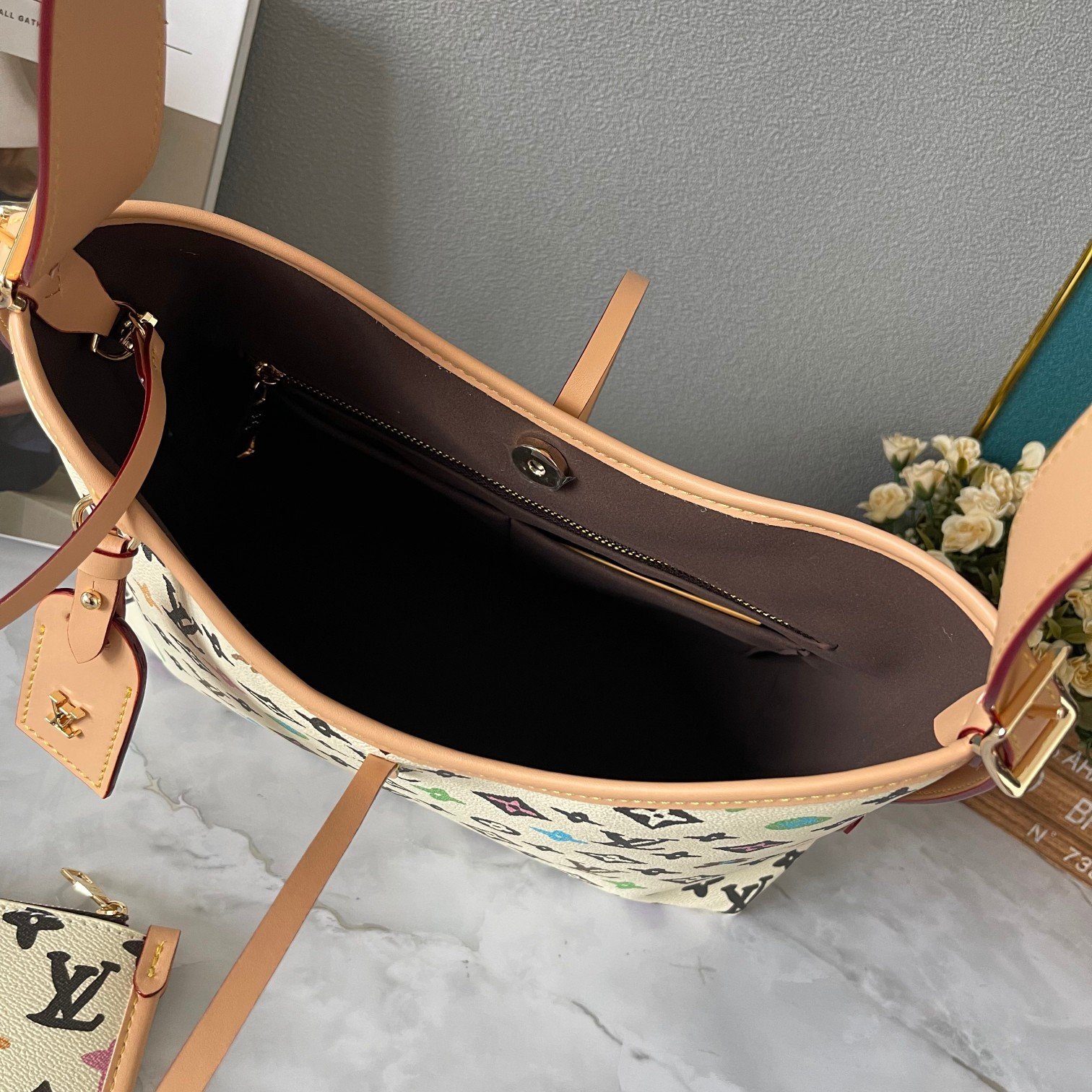 Handbag. crafted with Monogram canvas and leather trim to create a body-hugging design. The spacious interior features a zippered pocket. The detachable zippered clutch adds functional elements. The buckle-adjustable handle is long. Small size: 29 x 24 x 12 cm.