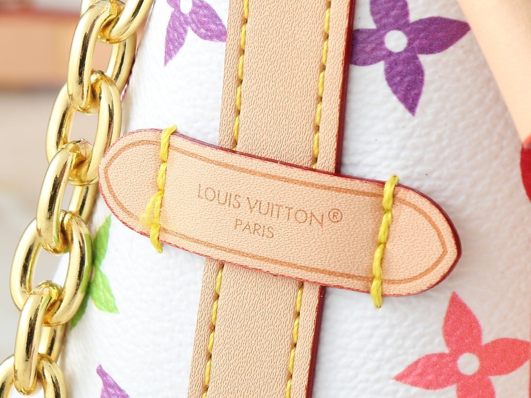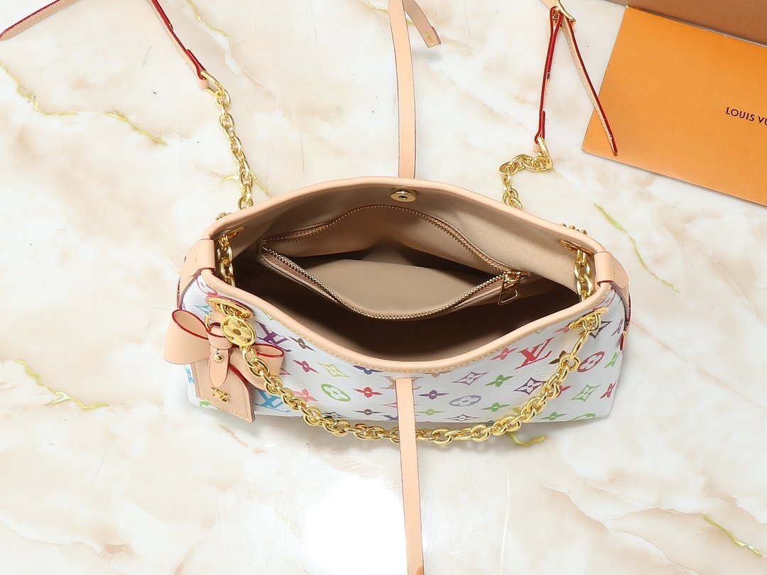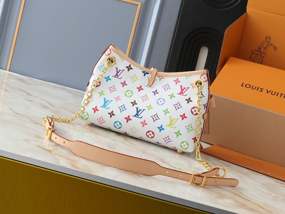 The upgraded M13014 M24860 CarryAll BB bag is crafted from Monogram canvas. featuring Monogram flowers embellished with eye-catching chains. perfect for both day and night occasions. The leather plaque and tie closure complement each other beautifully. while the zippered interior pocket makes it convenient to access credit cards. Dimensions: 26.0 x 17.0 x 10.0 cm