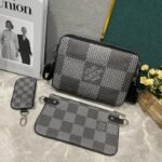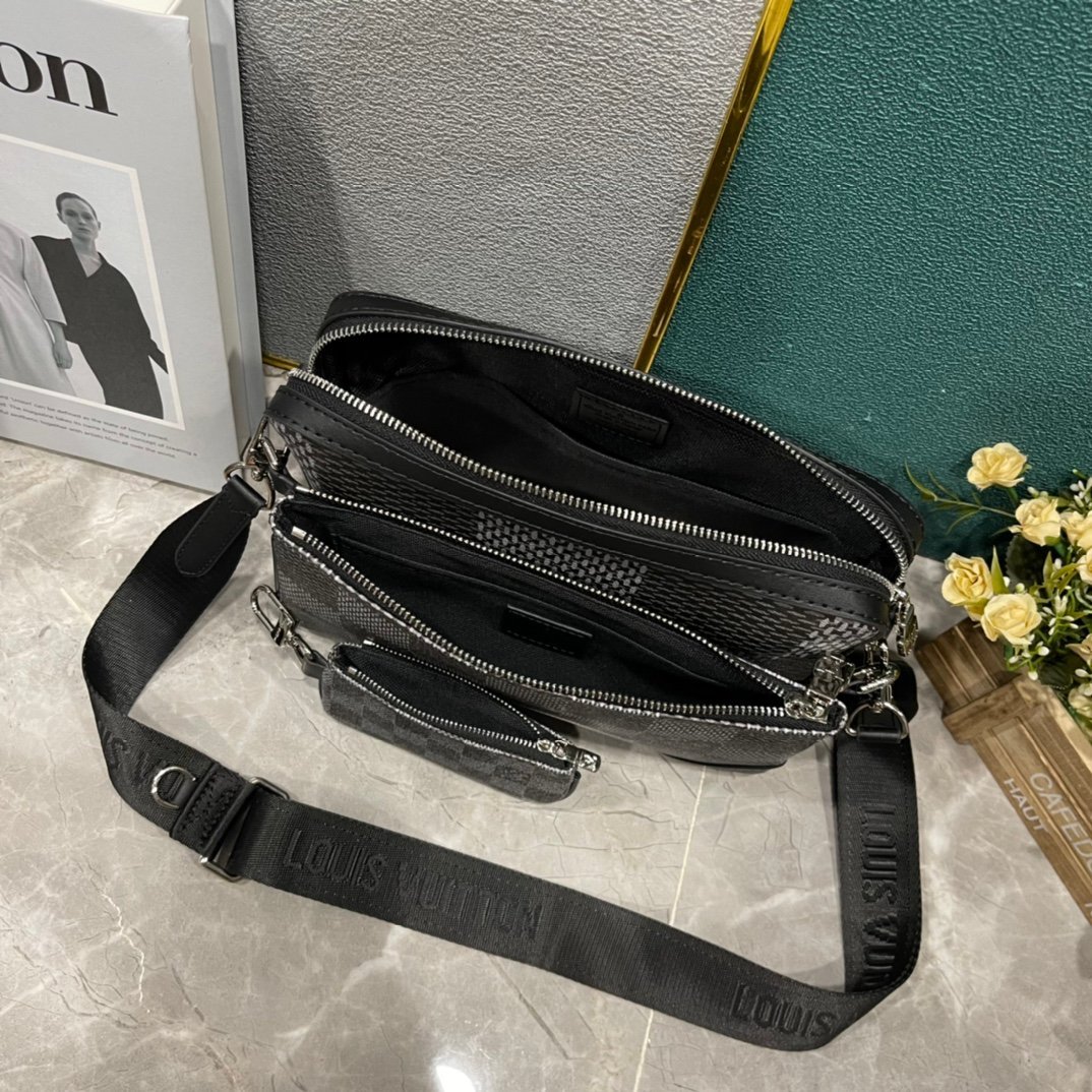 The upgraded versions M69443. M50017. M50027. M45320. and M69827. The new Trio messenger bag is made of Monogram Eclipse canvas and Monogram Eclipse Reverse canvas. The iconic monochromatic grey pattern highlights the lines of this multi-functional patchwork design. In addition to the functions of a traditional crossbody bag. it is also equipped with a detachable zipper bag and a coin purse attached to the strap. Dimensions: 25.0 x 18.5 x 7.0 cm.